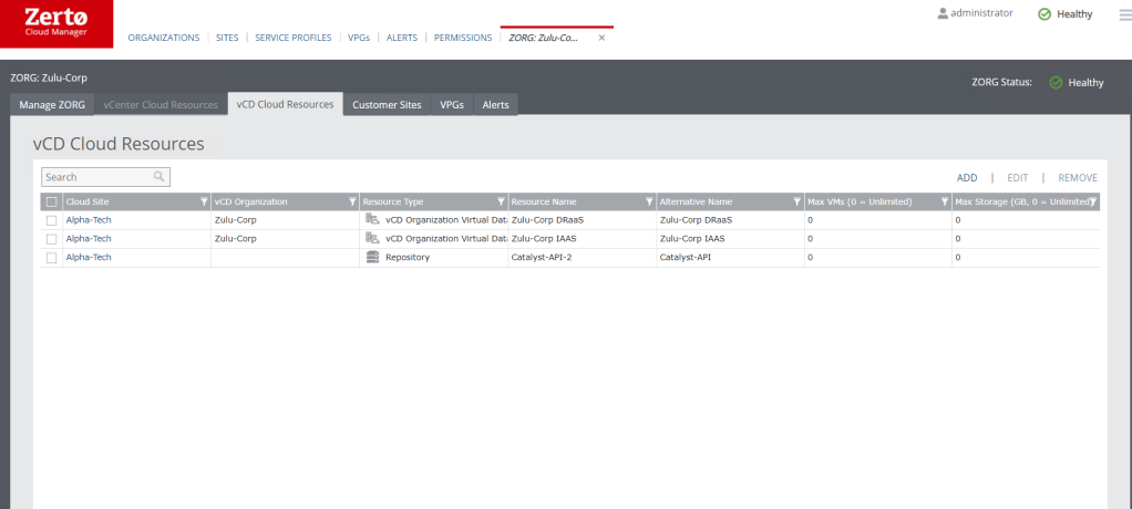 One of the most important sections in the ZCM is the ability to assign resources to a ZORG ensuring that no Zorg can use resources they have not been assigned. a ZVM can either be configured to use vCenter OR VCD this shows in the sites tab I showed earlier.