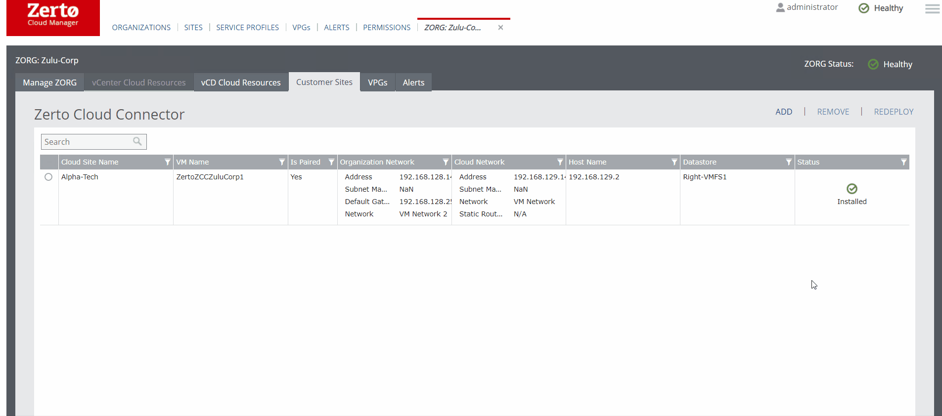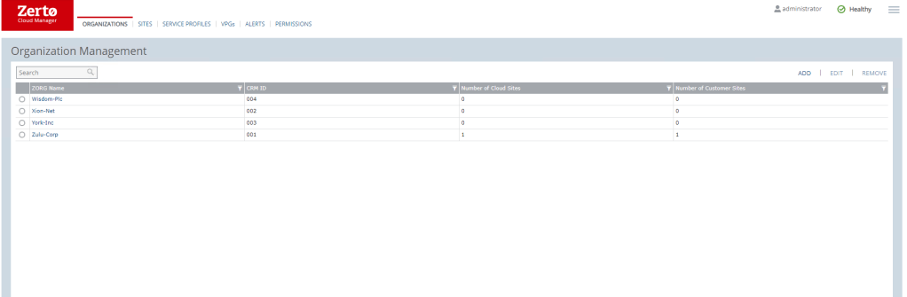 In this section we show all the ZORG’s that are currently configured inside the ZCM, as the ZCM is a global entity across the entire Zerto estate a ZORG only needs to be created once and can now be used across the entire Zerto estate wherever it is required.